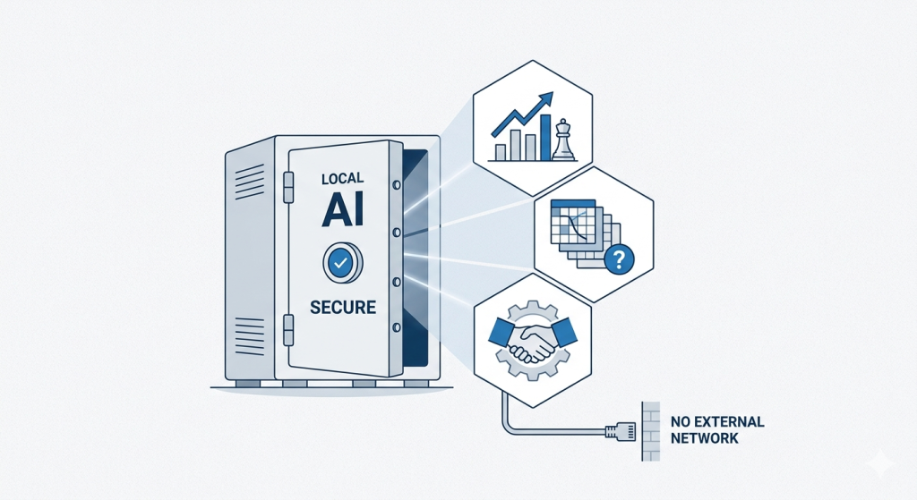 弊社では、こうしたセキュリティ上の懸念を完全に払拭し、かつ汎用的なAIでは到達し得ない深い洞察を得るため、外部ネットワークから完全に遮断された環境で動作する「完全ローカル完結型LLM(大規模言語モデル)」を用いた戦略策定支援を提供しています。